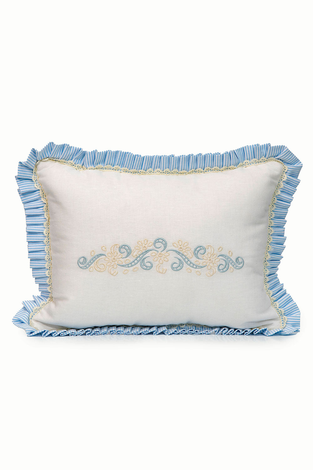 Wrap your little one in pure softness with this 100 % linen pillow, both in a serene off‑white shade. Trimmed with lace and fine cotton borders featuring delicate baby‑blue and white stripes. Machine‑embroidered in an elegant palette of baby blue and pearl tones, the design exudes timeless charm and refinement.