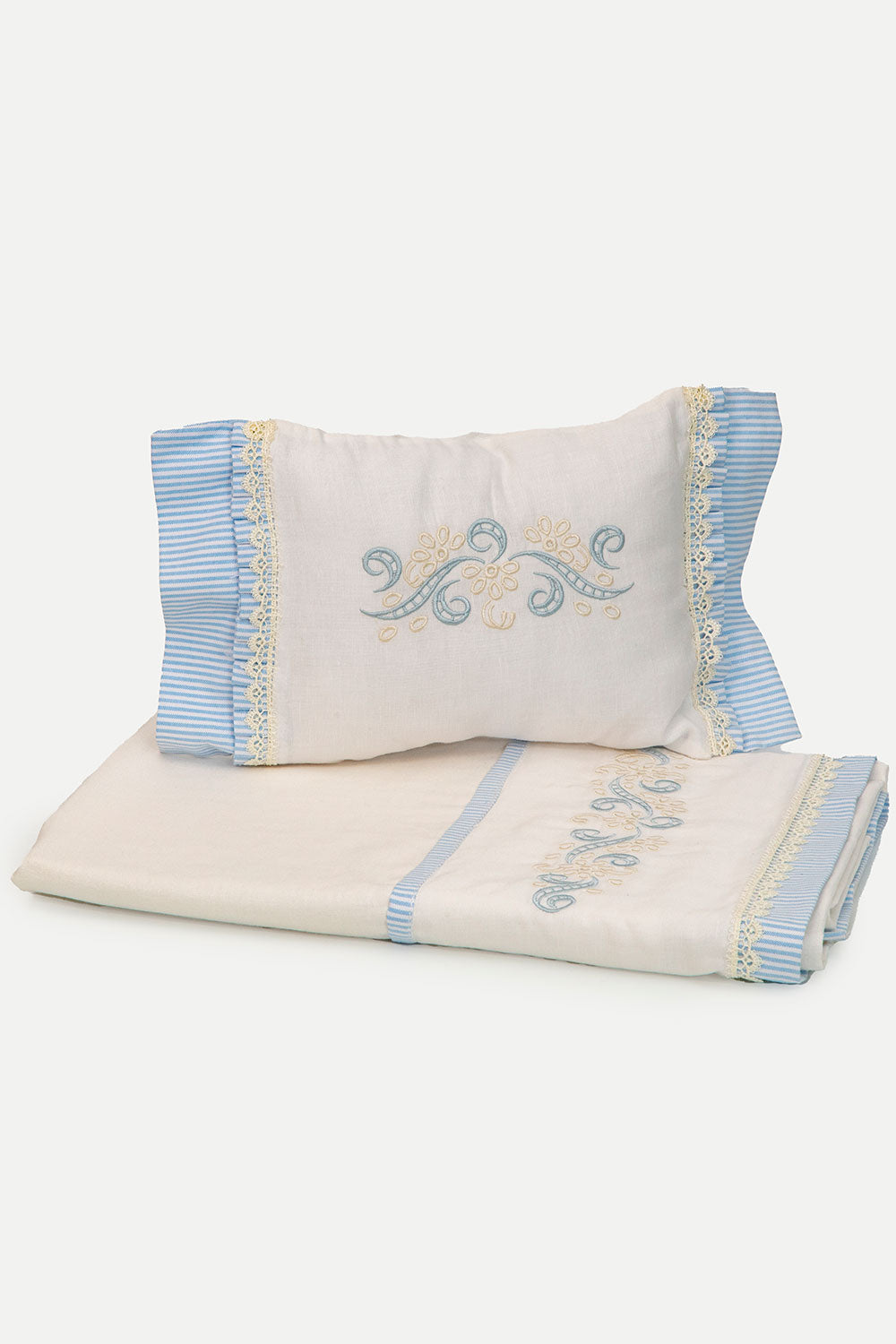 Wrap your little one in pure softness with this 100 % linen sheet and matching cushion, both in a serene off‑white shade. Each piece is exquisitely trimmed with lace and fine cotton borders featuring delicate baby‑blue and white stripes. Machine‑embroidered in an elegant palette of baby blue and pearl tones, the design exudes timeless charm and refinement.