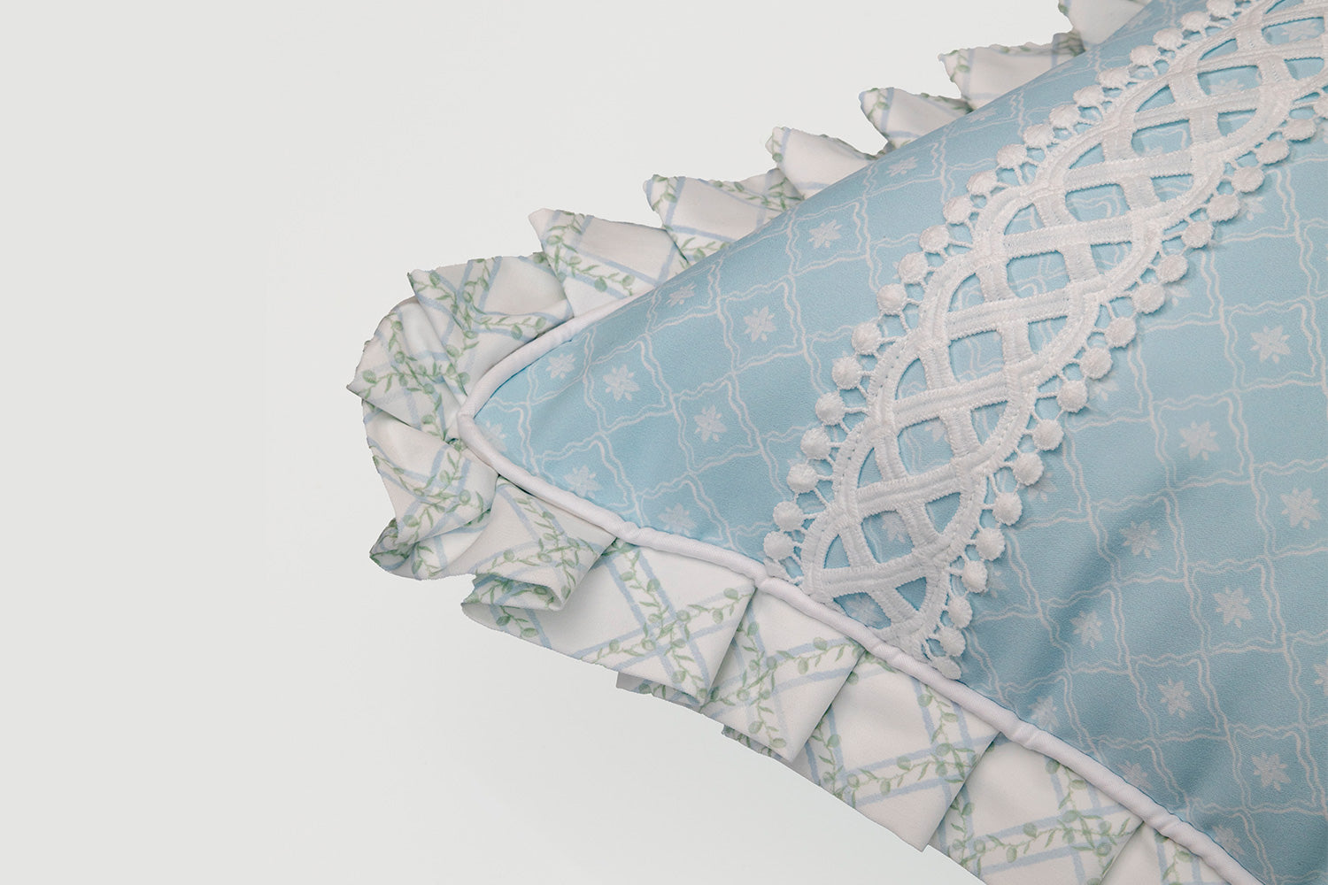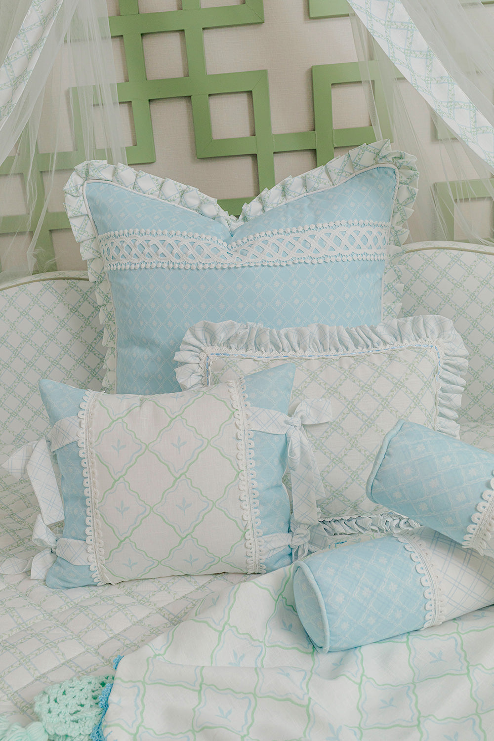 Cushion made from a soft-to-the-touch, durable, and flexible drill blend (80% polyester, 15% cotton, 5% spandex). Printed with our exclusive textile designs and finished with cotton guipure accents. Perfect for adding comfort and a splash of color to your little one’s room.