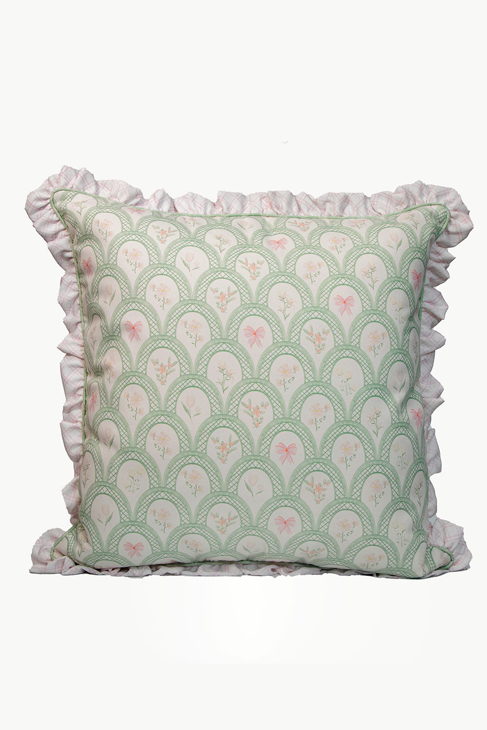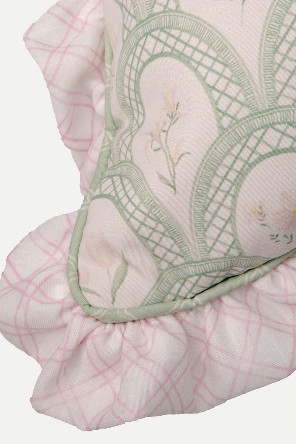 Cushion made from a soft-to-the-touch, durable, and flexible drill blend (80% polyester, 15% cotton, 5% spandex). Printed with our exclusive textile designs and finished with cotton guipure accents. Perfect for adding comfort and a splash of color to your little one’s room.