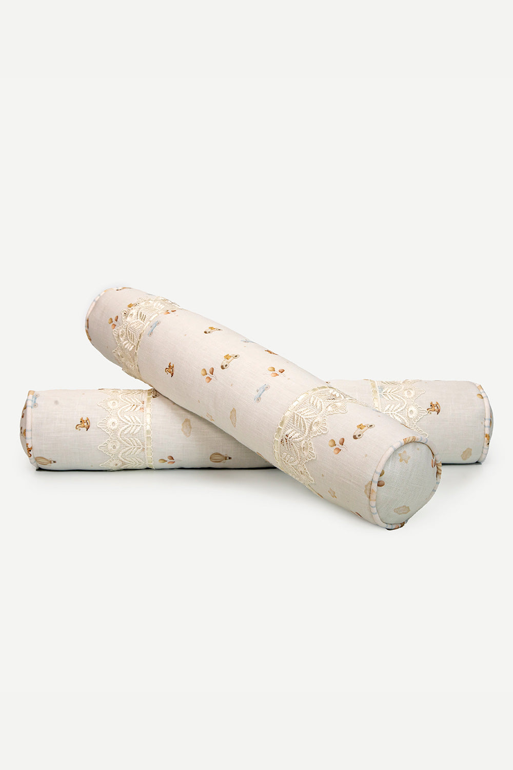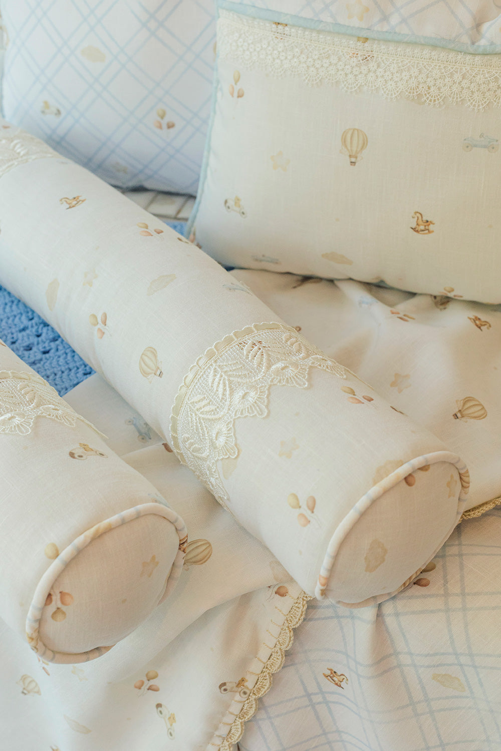 Bolster Pillows made from a soft-to-the-touch, durable, and flexible drill blend (80% polyester, 15% cotton, 5% spandex). Printed with our exclusive textile designs and finished with cotton guipure accents. Perfect for adding comfort and a splash of color to your little one’s room.