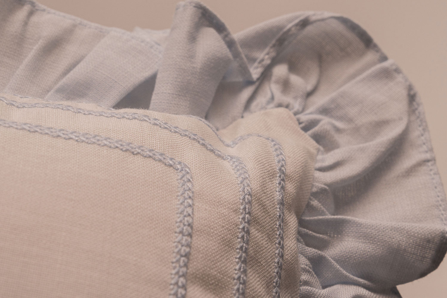 This mini pillow for your baby’s room is crafted from soft white cotton, offering a fresh and comfortable feel. Its charming baby blue trim adds a delicate, feminine touch—perfect for decorating your baby’s crib or your little girl’s bed.