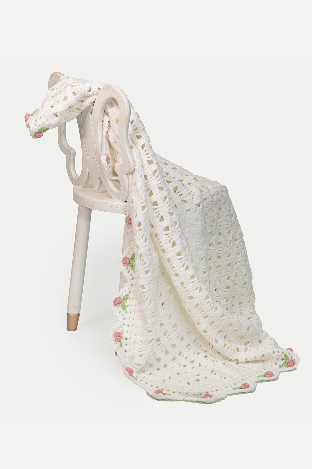 Keep your baby warm and cozy with this adorable handmade crochet blanket in white, featuring baby pink roses and green leaves. Made from 100% cotton for breathability and softness. The pattern may vary depending on the design.