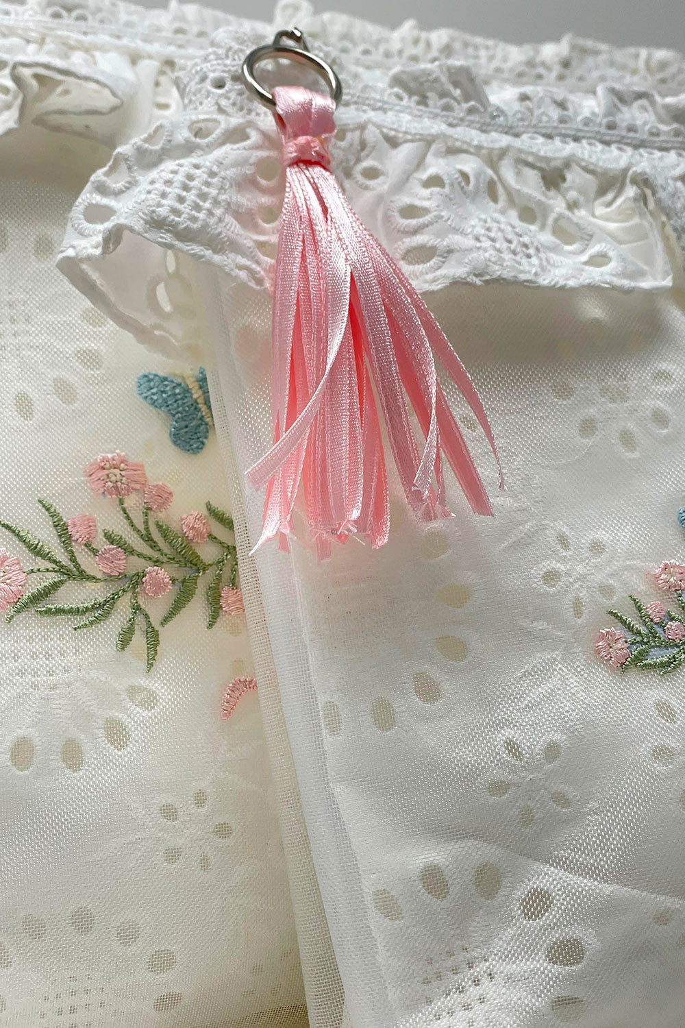 Keep your little adventurer’s belongings organized and stylish with our pouches. Two adorable bags featuring a unique design with embroidery and delicate lace details.