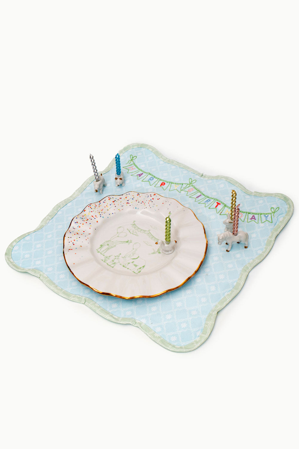 Celebrate in style with our Happy Animal Birthday plate, hand-painted with love and adorned with a gold rim. This stunning piece features 5 animal candle holders and gold accents, paired with a matching placemat, all made from ceramic. Plastic-free and safe for food without leaving any residues. A truly unique and special way to mark milestones and birthdays. Perfect for gifting or creating special memories with your children.