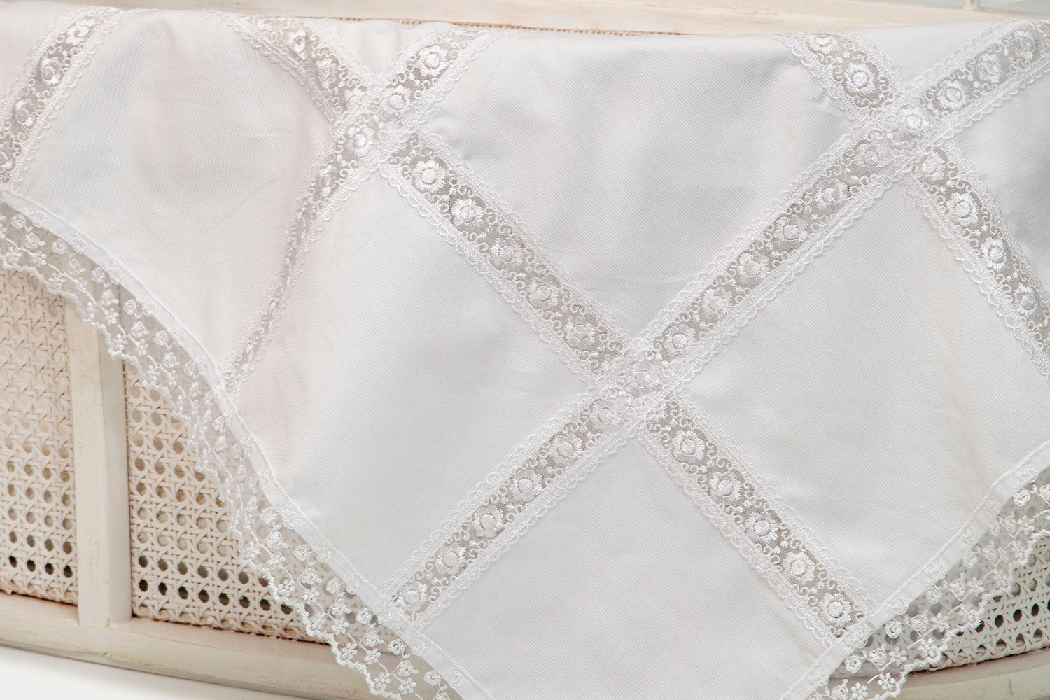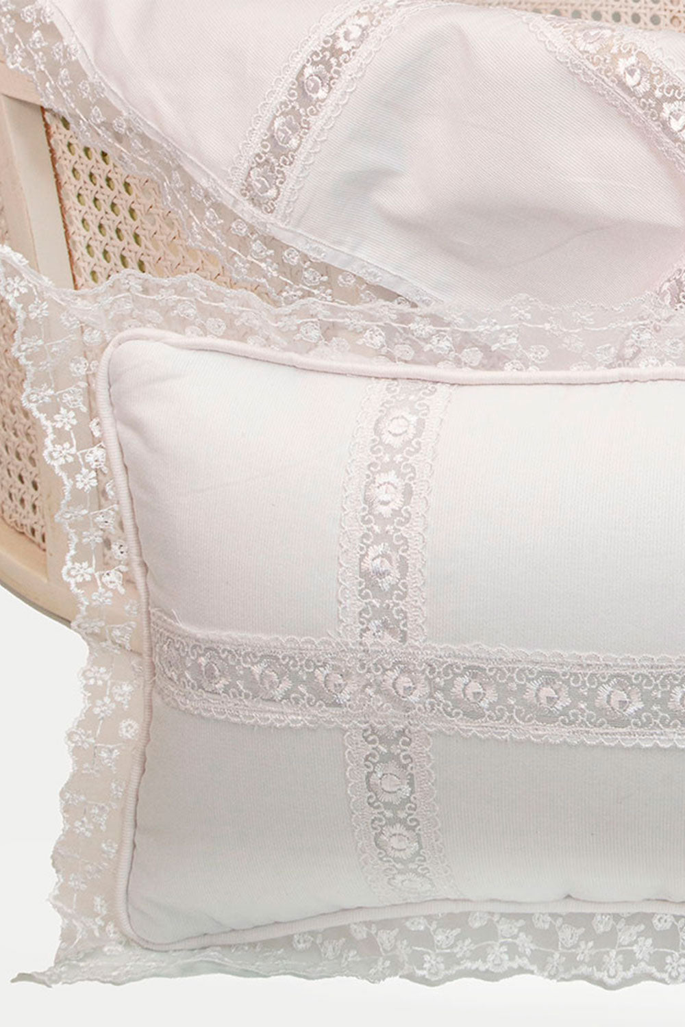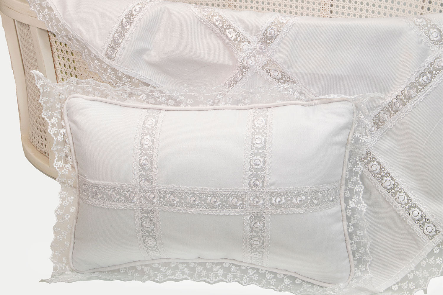 Crafted with utmost care, this delicate baby cushion features a soft piqué toquilla adorned with interwoven lace squares, creating a charming and elegant design. The intricate lacework adds a touch of sophistication, making it a perfect accessory for your baby's nursery or a thoughtful gift for new parents.