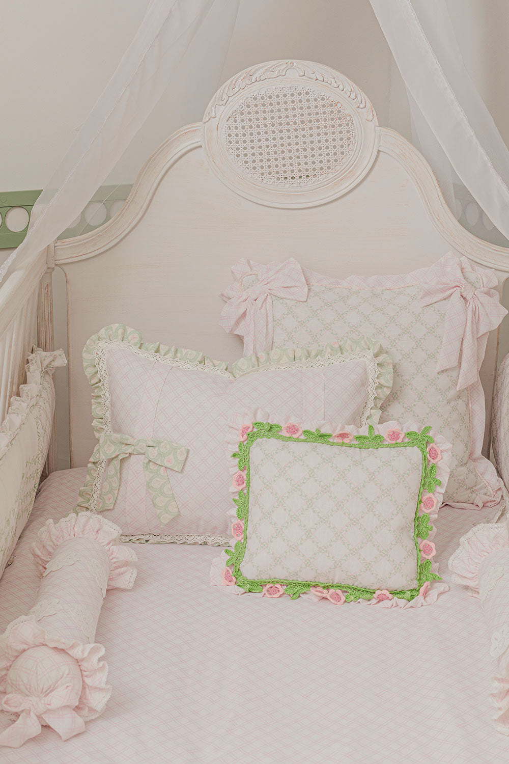 Cushion made from a soft-to-the-touch, durable, and flexible fabric blend (90% polyester, 10% linen blend). Printed with our exclusive textile designs and finished with cotton guipure accents. Perfect for adding comfort and a splash of color to your little one’s room.