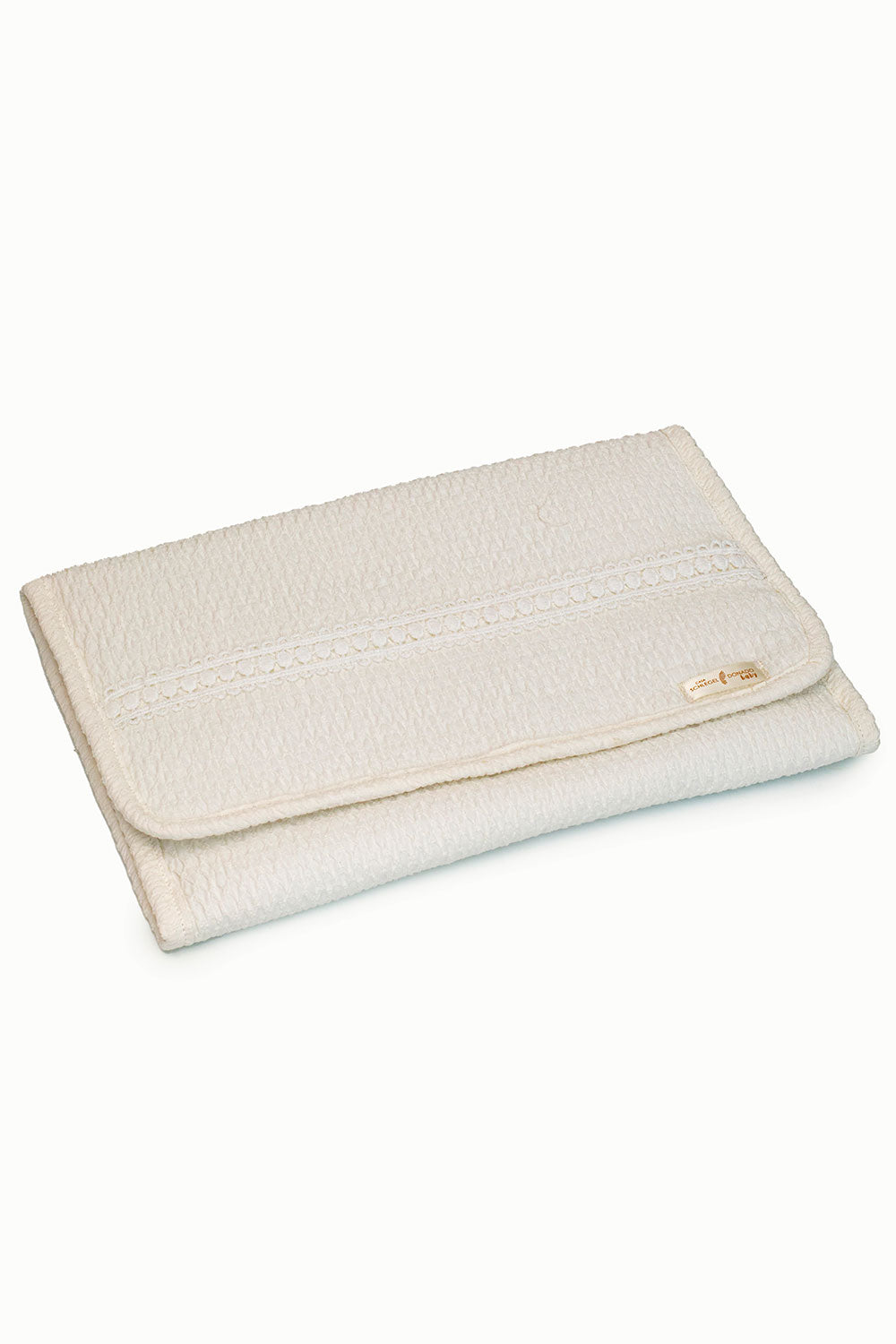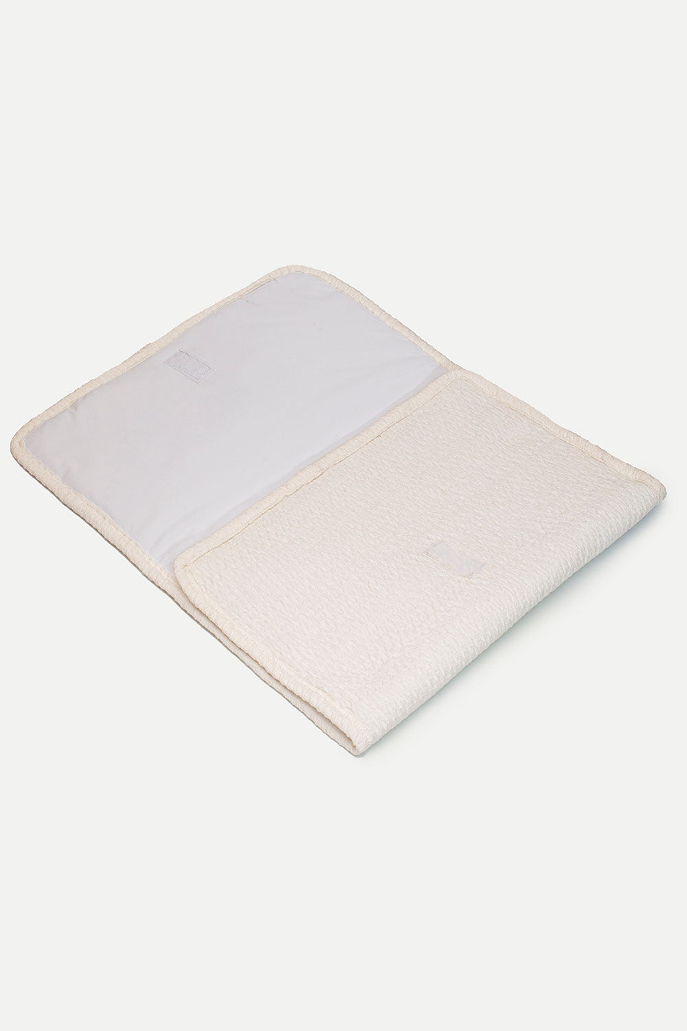 This stylish and practical changing pad features an off‑white exterior crafted from a subtly textured fabric, beautifully edged with delicate lace for a soft, elegant look. Ideal for keeping in your diaper bag, it opens up to reveal a waterproof inner layer that makes cleanup easy and simply wipe it down after use.