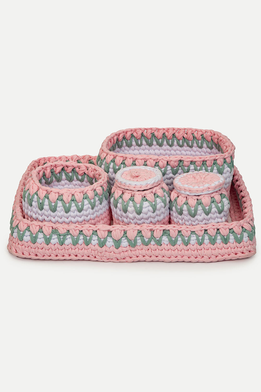 Hand‑Woven Cotton Changing Dresser Basket Set in Sage, Pink & White