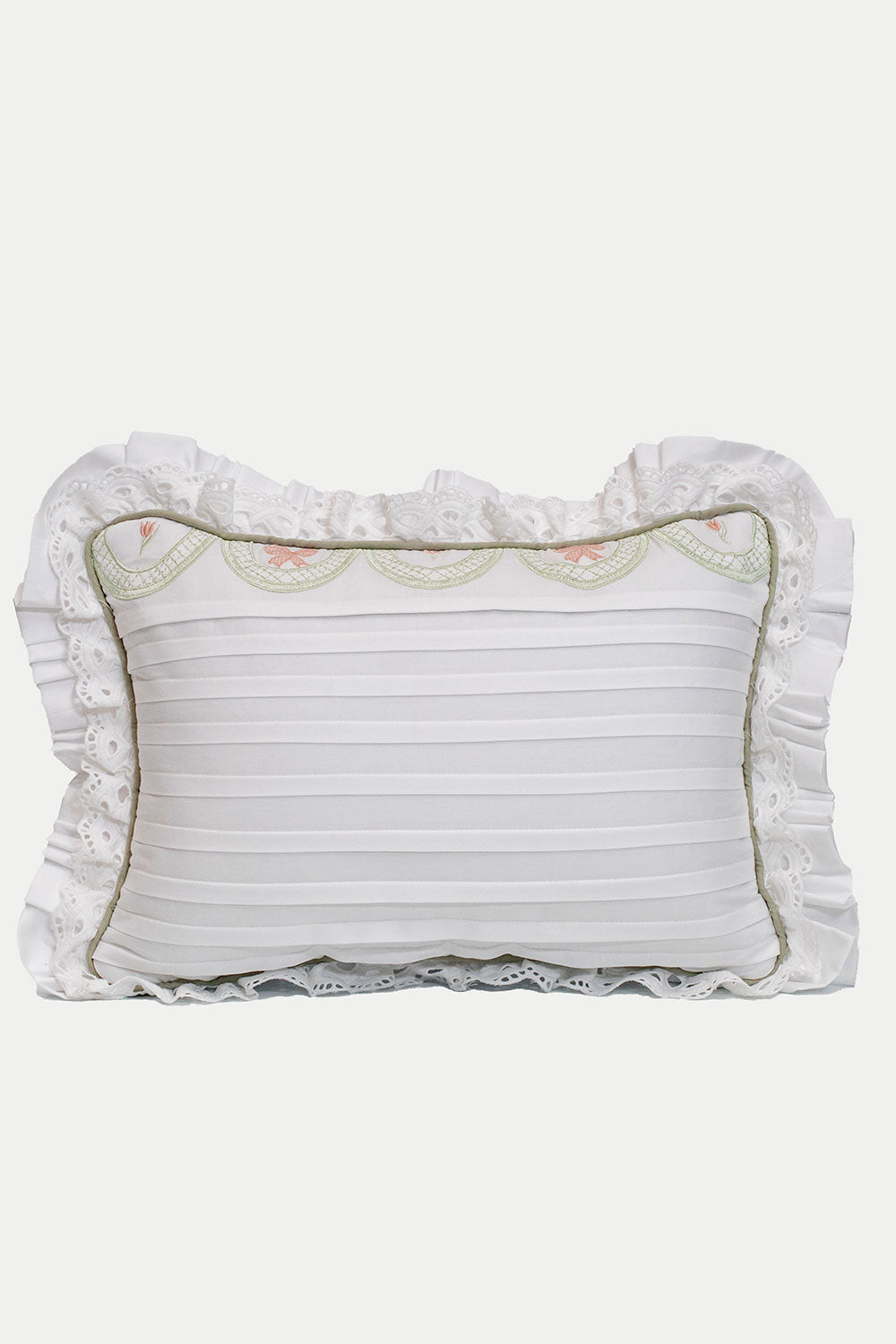 Wrap your little one in timeless elegance with this charming baby pillow . They are crafted from 100 % white cotton, naturally breathable, gentle on delicate skin. They’re beautifully framed with sage cotton borders and lace adding a subtle touch of nostalgic sweetness. Sage Thrillage & Pink Bows with Floral Embroidery design showcases delicate sage thrillage, pink bows, and floral blossoms.