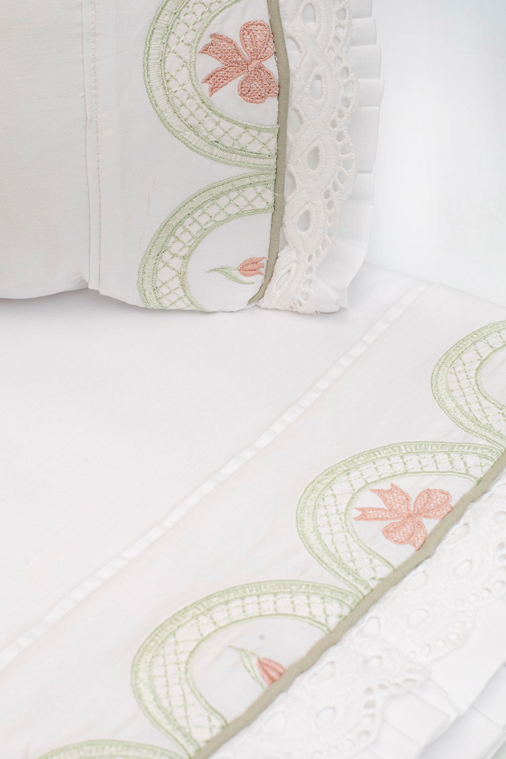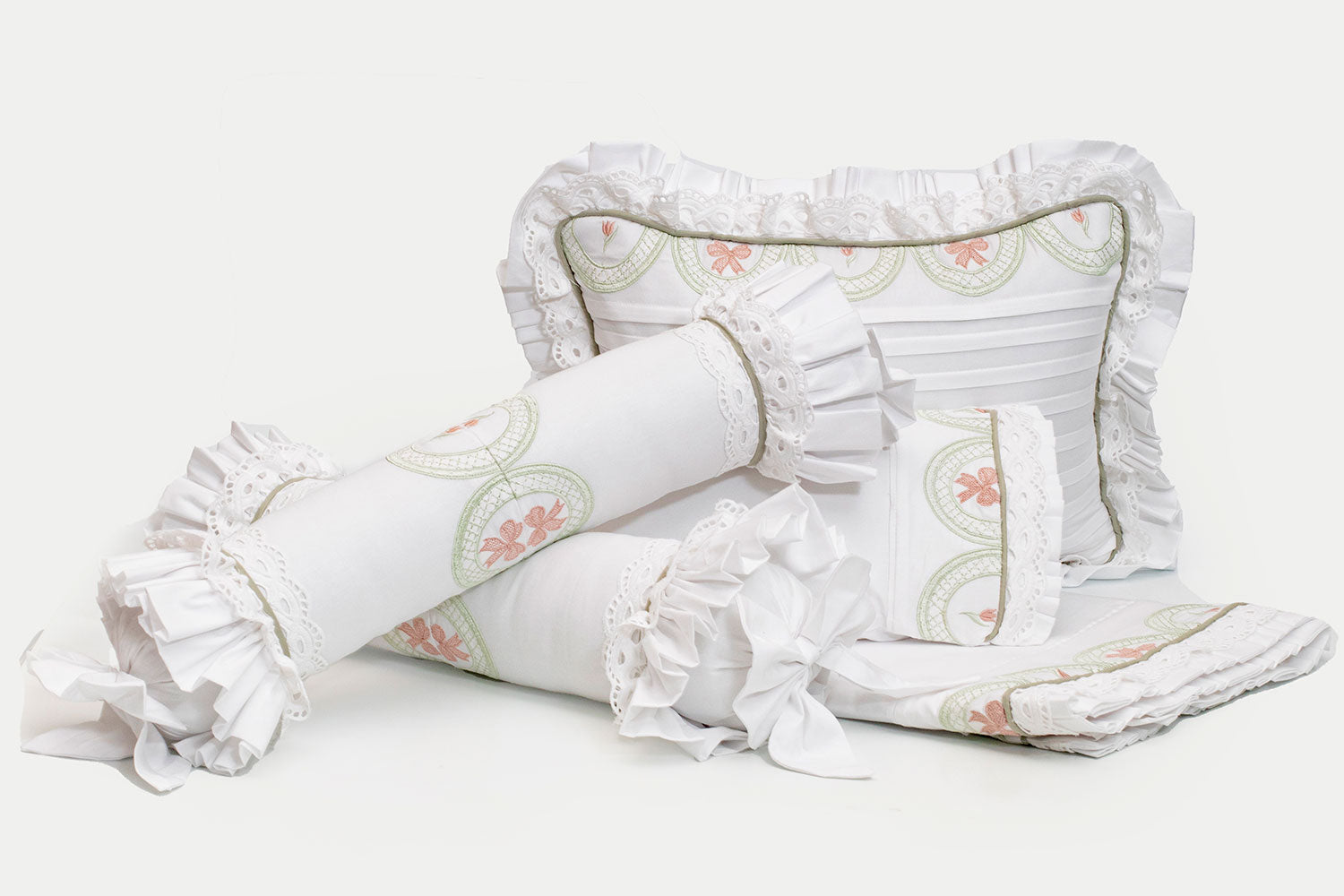 Wrap your little one in timeless elegance with this charming baby bedding duo. Both the sheet and cushion are crafted from 100 % white cotton, naturally breathable, gentle on delicate skin. Sage Thrillage & Pink Bows with Floral Embroidery design showcases delicate sage thrillage, pink bows, and floral blossoms.