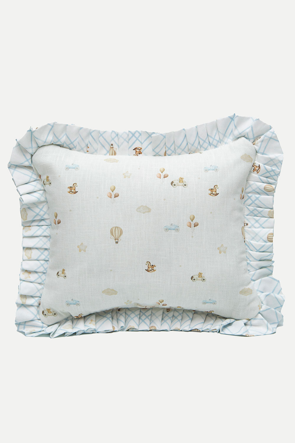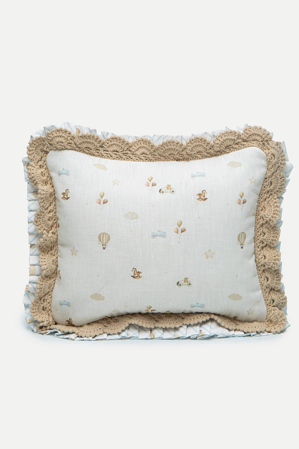Cushion made from a soft-to-the-touch, durable, and flexible fabric blend (90% polyester, 10% linen blend). Printed with our exclusive textile designs and finished with cotton guipure accents. Perfect for adding comfort and a splash of color to your little one’s room.
