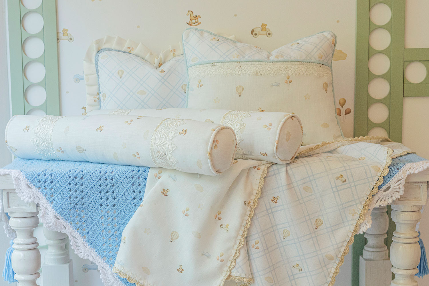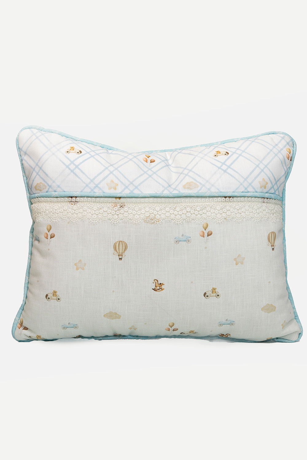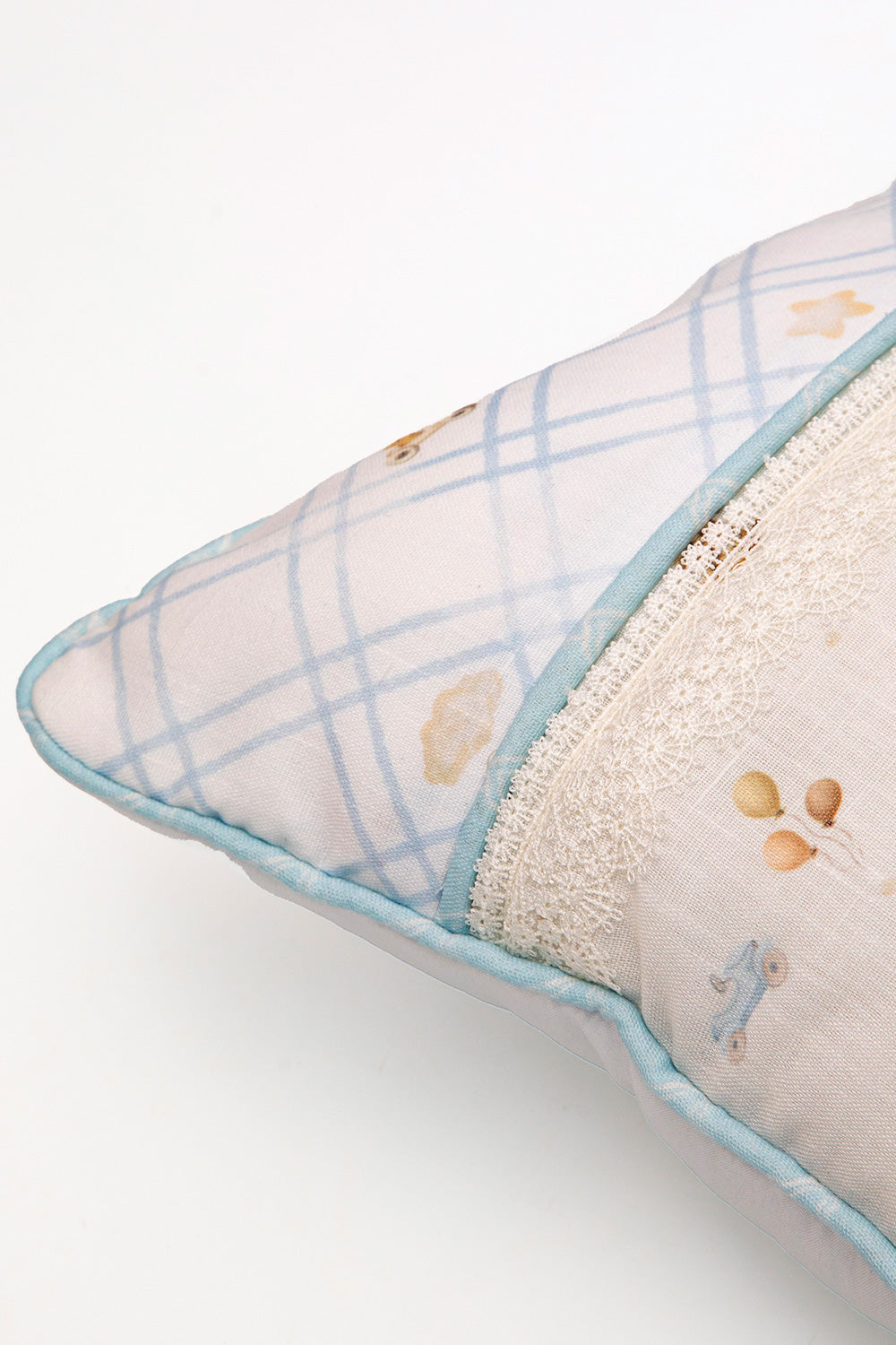 Cushion made from a soft-to-the-touch, durable, and flexible fabric blend (90% polyester, 10% linen blend). Printed with our exclusive textile designs and finished with cotton guipure accents. Perfect for adding comfort and a splash of color to your little one’s room.