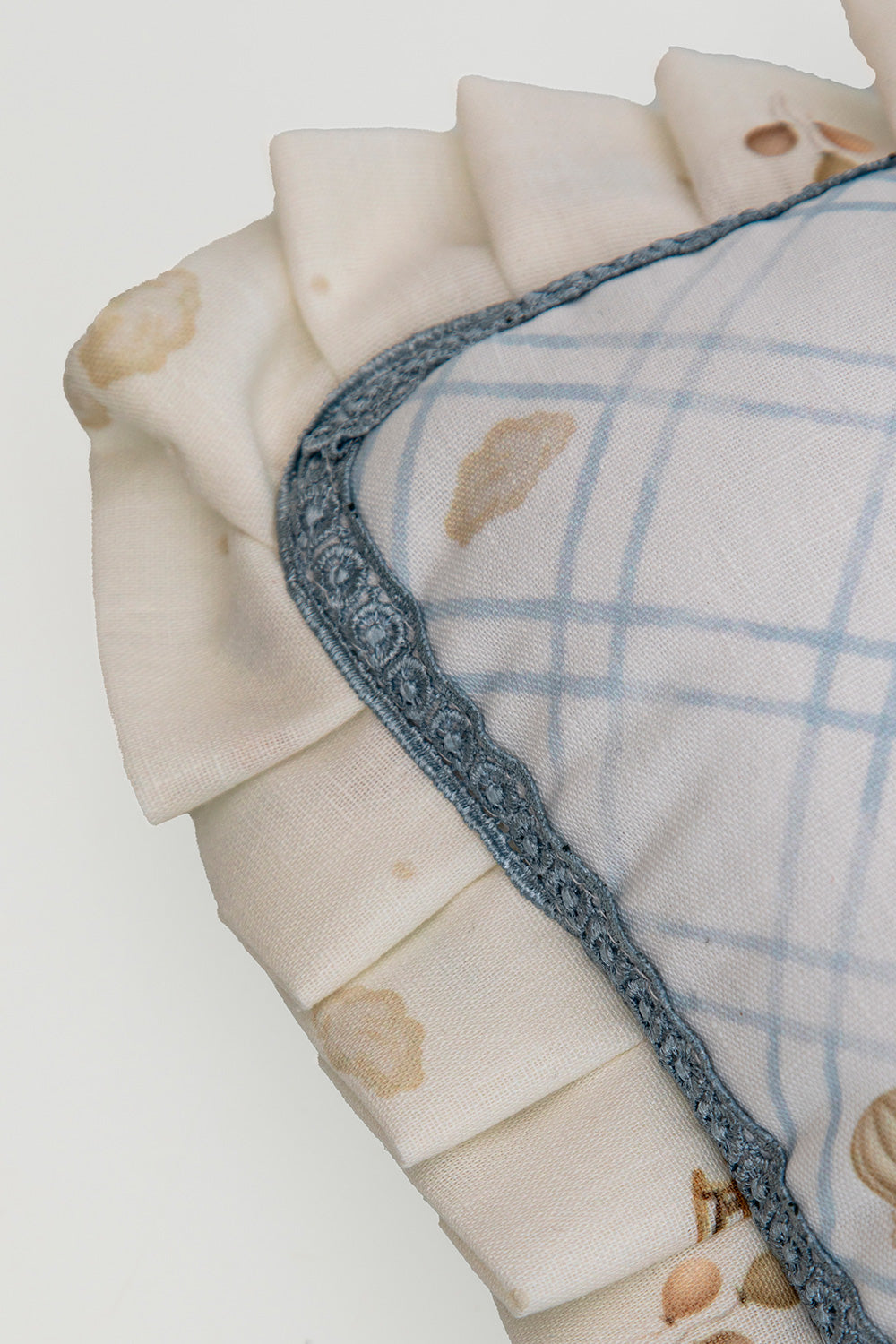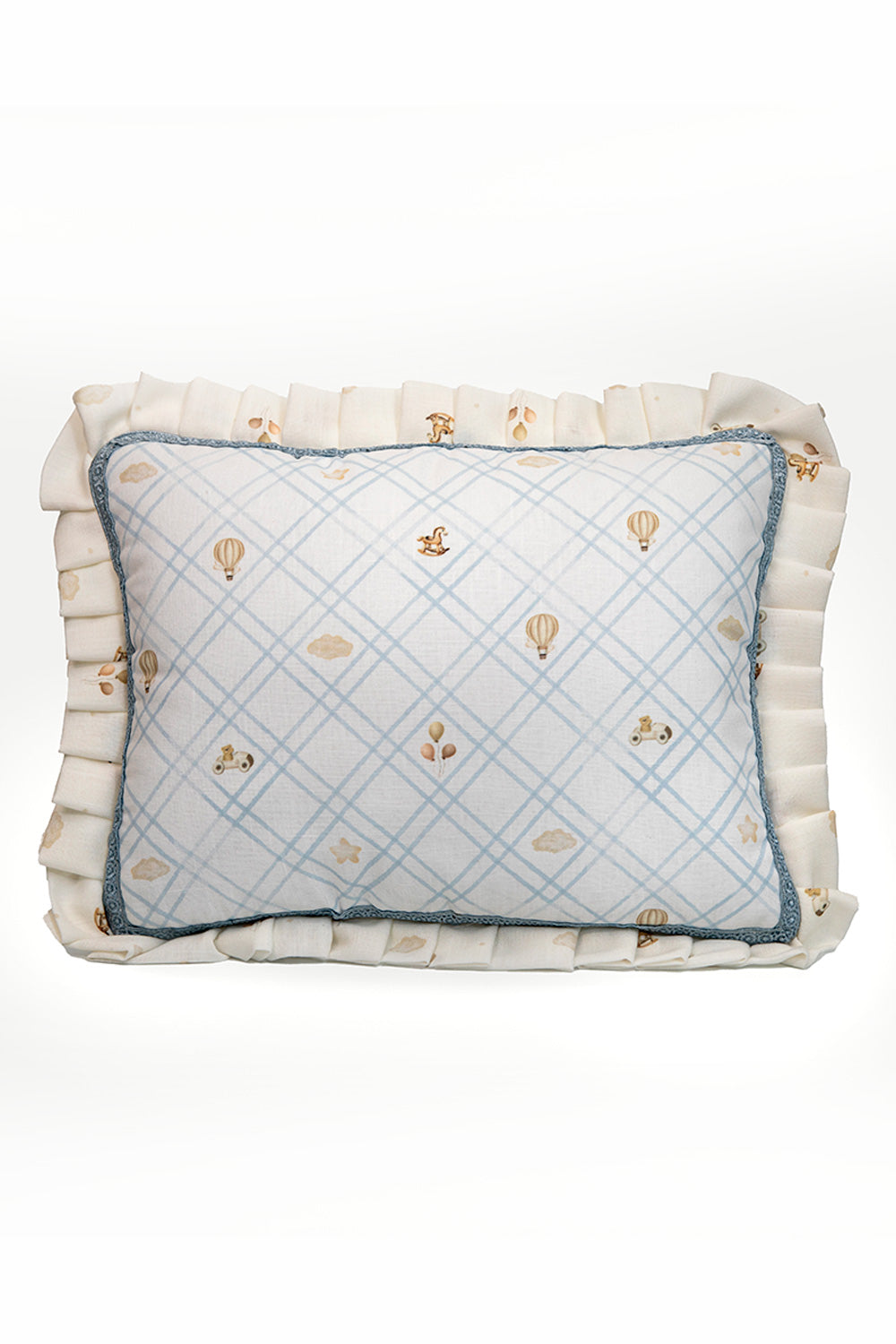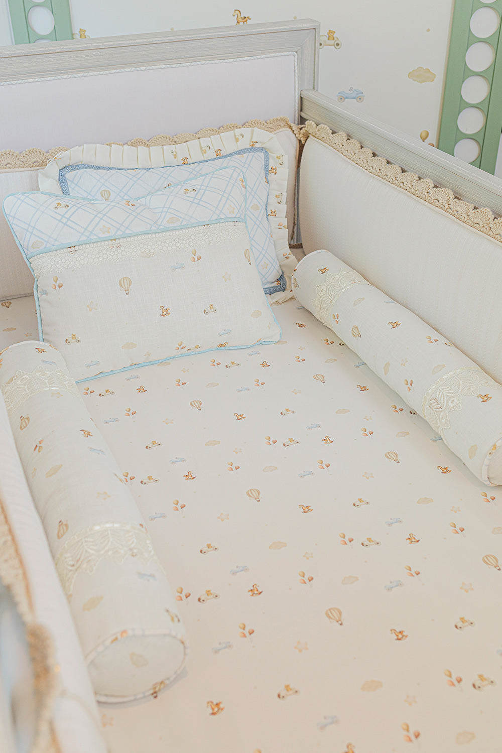 Cushion made from a soft-to-the-touch, durable, and flexible fabric blend (90% polyester, 10% linen blend). Printed with our exclusive textile designs and finished with cotton guipure accents. Perfect for adding comfort and a splash of color to your little one’s room.