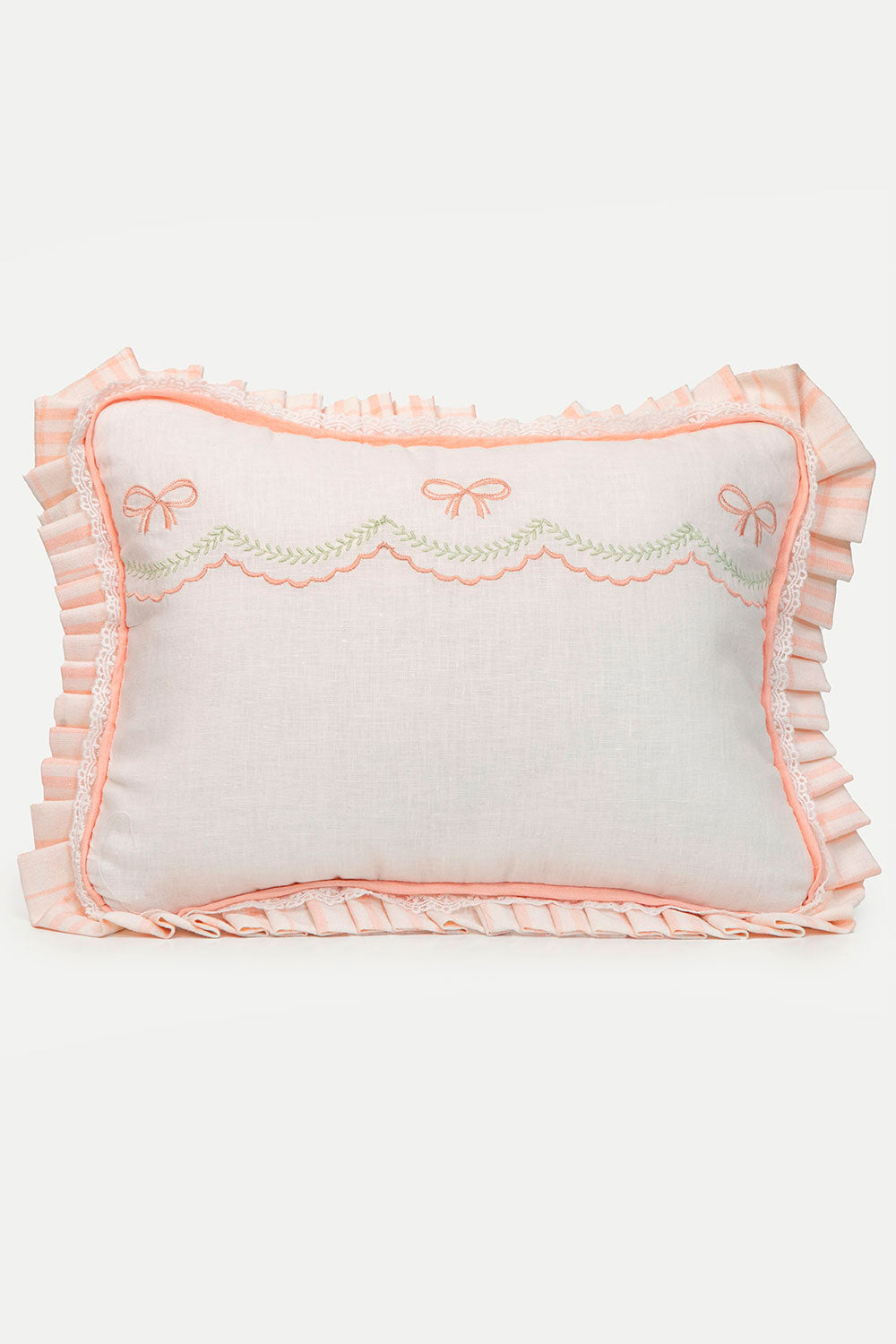Wrap your little one in timeless elegance with this charming baby pillow. They are crafted from 100 % off-white linen, naturally breathable, gentle on delicate skin. They’re beautifully framed with cotton borders in a vintage “rose old pink” and white checkered pattern, adding a subtle touch of nostalgic sweetness. The accents continue with refined machine embroidery: delicate bows and gentle scallops in blush pink and sage green tones, bringing an air of handcrafted sophistication. This lovely combination blends soft florals with understated greenery, creating a serene and classic look for any nursery.