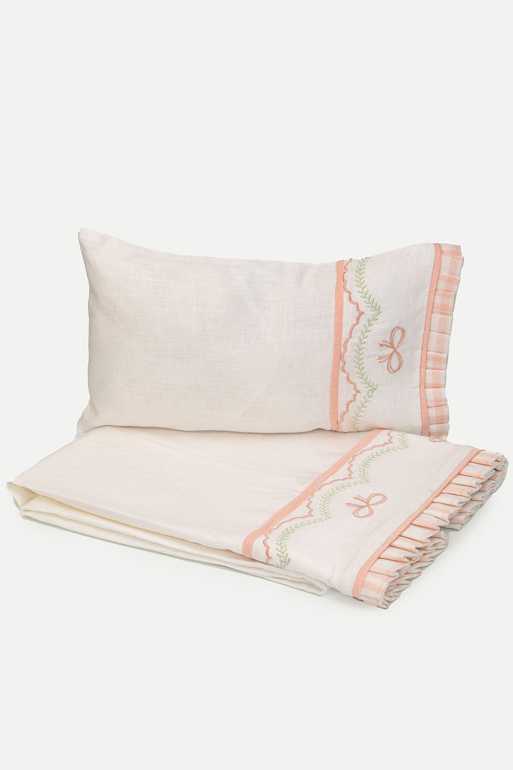 Wrap your little one in timeless elegance with this charming baby bedding duo. Both the sheet and cushion are crafted from 100 % off-white linen, naturally breathable, gentle on delicate skin. They’re beautifully framed with cotton borders in a vintage “rose old pink” and white checkered pattern, adding a subtle touch of nostalgic sweetness. The accents continue with refined machine embroidery: delicate bows and gentle scallops in blush pink and sage green tones, bringing an air of handcrafted sophistication. This lovely combination blends soft florals with understated greenery, creating a serene and classic look for any nursery.